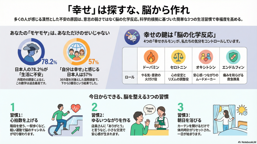 精神論ではない。「もっと頑張れ」でもない。この記事では、脳内物質──いわゆる「幸せホルモン」と呼ばれるものたちの仕組みを紐解きながら、日常にすぐ取り入れられる小さな習慣を提案したい。