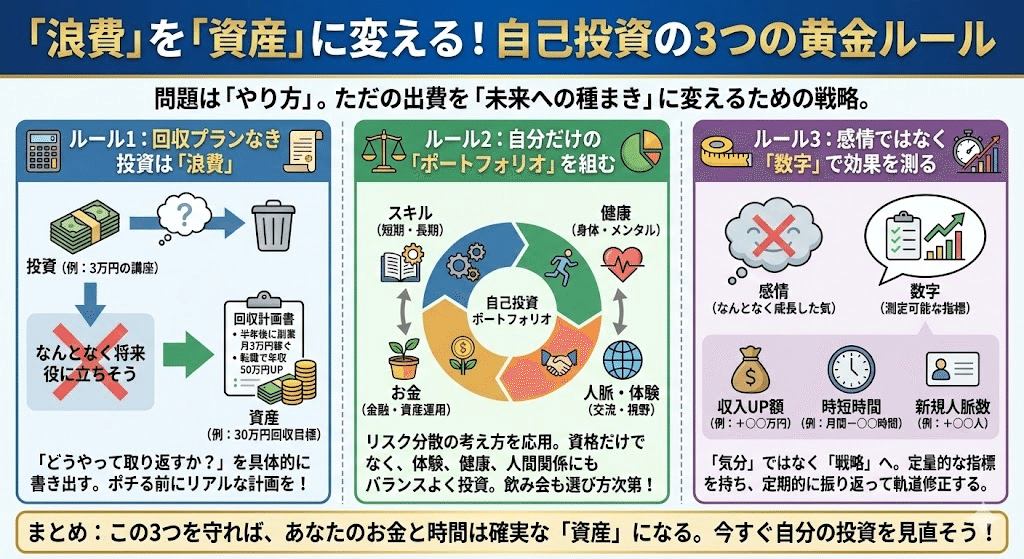 自己投資そのものが悪いわけではない。問題は「やり方」だ。ここからは、浪費を本当の資産に変えるための3つのルールを共有したい。