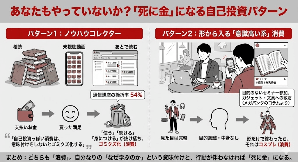 メガバンクのコラムでは、目的意識のないセミナー参加や、ガジェット・文具への散財を「悪い自己投資」の典型例として挙げている。目標が曖昧なまま交流会に参加したり、「なんとなく良さそう」で自己啓発本を衝動買いしたり。