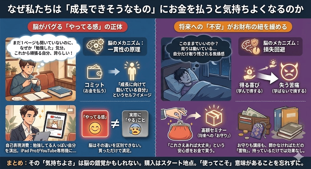 これは、行動経済学でいう「一貫性の原理」が働いている状態だ。人は、自分が一度コミットしたこと(この場合は「自己投資をする自分」というイメージ)と一貫した行動を取りたくなる心理がある。お金を払った時点で「成長に向けて動いている自分」というセルフイメージが生まれ、それを維持したいという欲求が働く。
