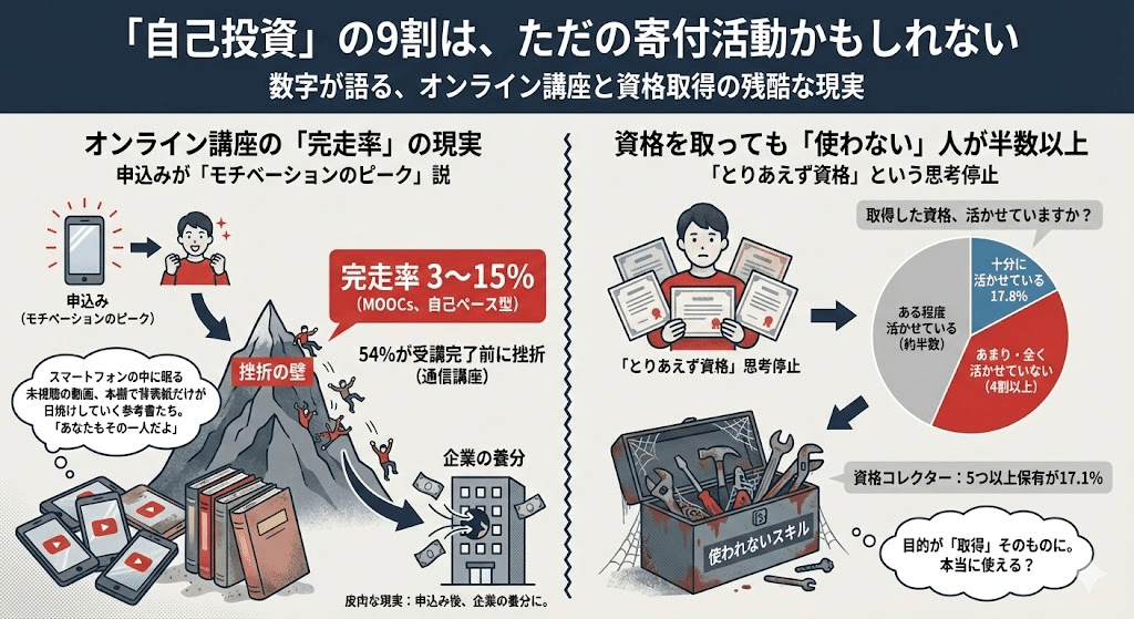 通信講座の挫折率54%という数字は、まさにこのパターンの象徴だ。「買った満足」で完結し、その先の「使う」「続ける」「身につける」というプロセスが完全に抜け落ちている。