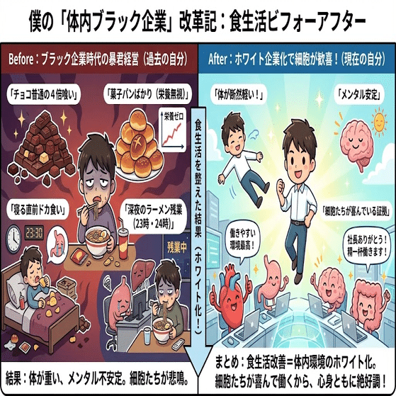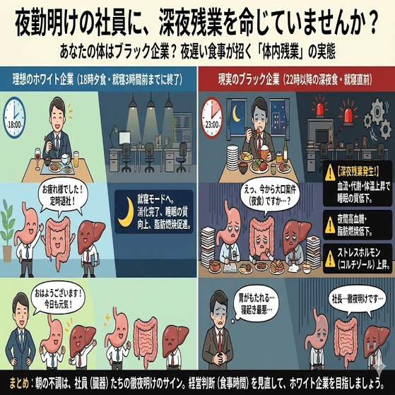僕自身の話をすると、以前は食事の「時間」がひどいものでした。夜遅く、寝る直前に夜食を食べる。社長である自分は寝るために帰宅し、意識をオフにする。でも、残された細胞や臓器たちは、その直前に放り込まれた食べ物を分解するために「残業」を強いられるわけです。