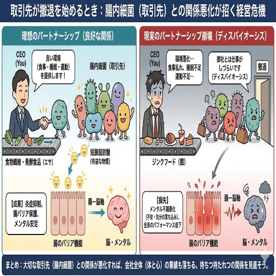 あなたの会社が良い環境を提供すれば、取引先も良い仕事を返してくれる。でも逆に、食事が乱れ、睡眠が足りず、運動もしない日々が続くと、腸内細菌は乱れ始めます。「ディスバイオーシス」と呼ばれる状態です。
