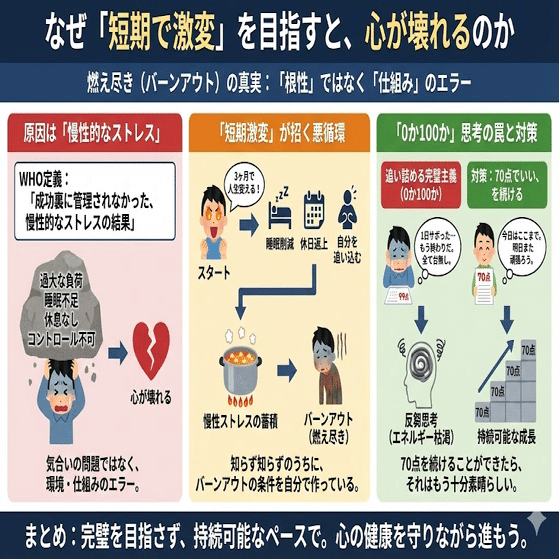 「3ヶ月で人生を変える」と意気込んで、睡眠を削り、休日を返上し、自分を追い込む。それは知らず知らずのうちに、バーンアウトの条件を自分で作り上げている行為に他ならない。