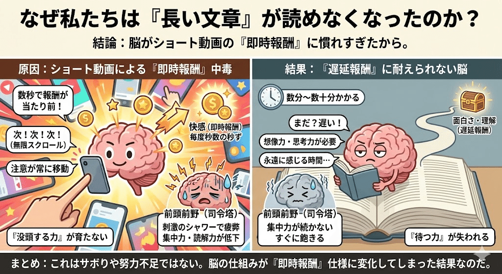 ショート動画は、私たちの脳に「注意の移動」を強制するツールだ。見過ぎれば、長い文章が読めなくなるのは、ある意味で当然の反応とも言える。