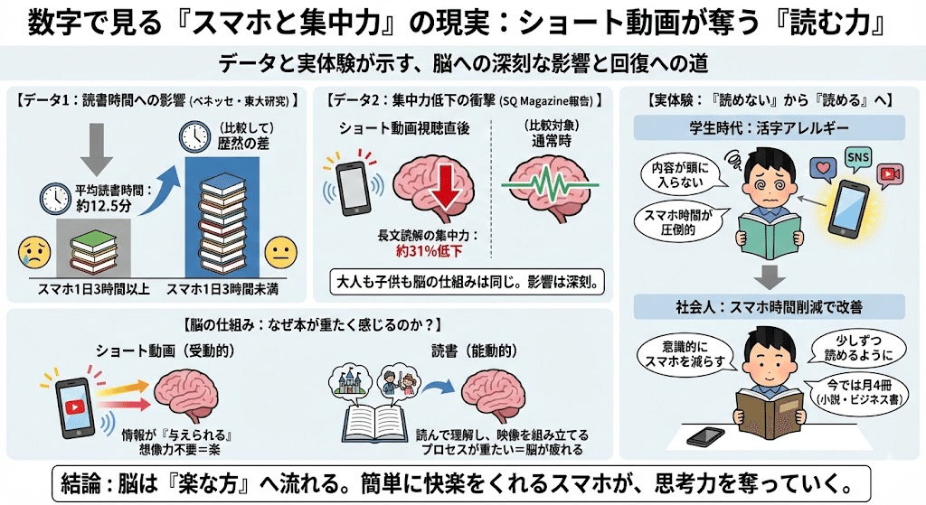 また、SQ Magazineの報告では、ショート動画を視聴した直後に長文を読むと、集中力が約31%低下することが示されている。