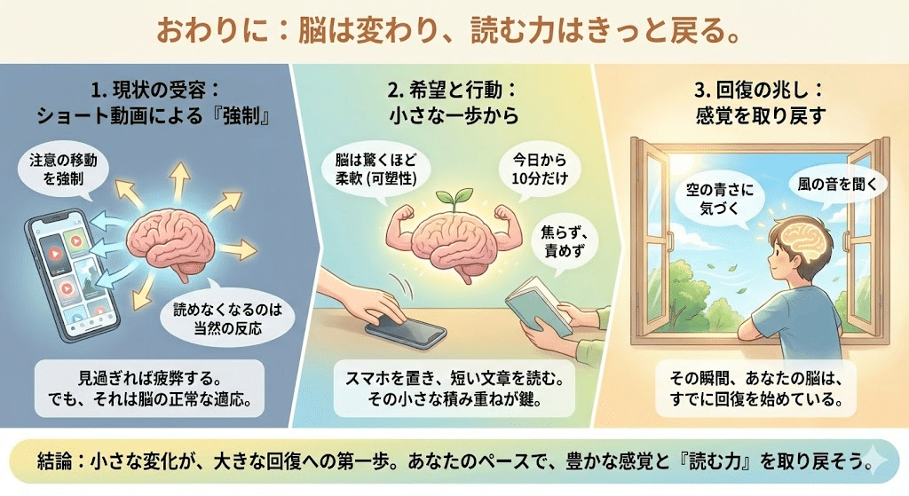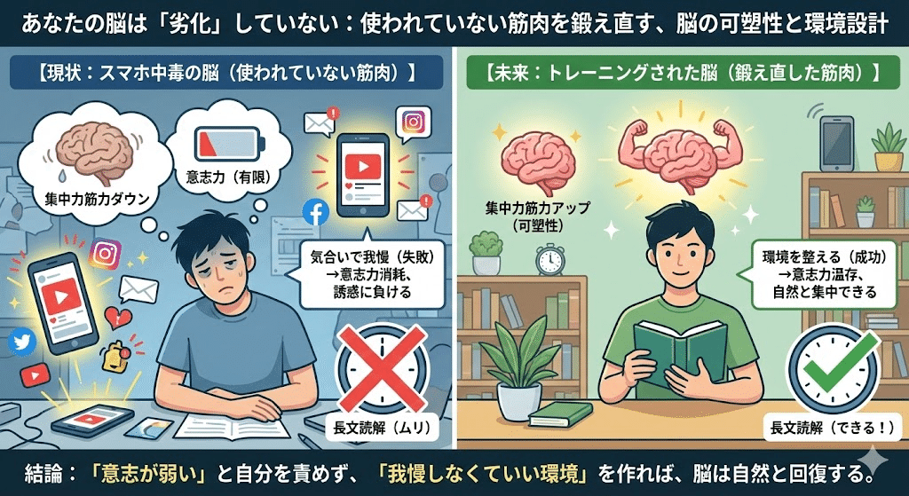 脳には「可塑性」という性質がある。変わる力、適応する力。今からでも、適切なトレーニングを積めば、集中力は必ず回復する。